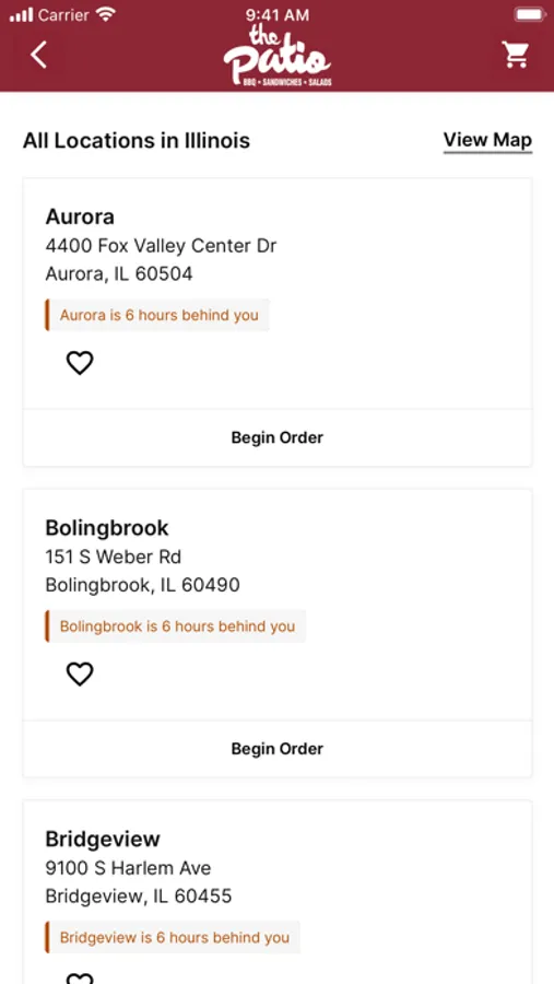 Online Ordering via The Patio's App or website has become a popular and convenient ordering tool for our customers! Simply click on the App or visit our website at www.patioribs.com and choose "Online Ordering." Then pick up your order at our Patio friendly Drive-Thru windows or inside any one of our six locations in Aurora, Bolingbrook, Bridgeview, Darien, Lombard or Orland Park, Illinois. We are open Monday through Thursday from 10:30 AM to 10:00 PM; Friday and Saturday from 10:30 AM to 11:00 PM; and on Sunday from 10:30 AM to 9:30 PM. All locations provide fast and friendly service, free drink refills, and no tip service!