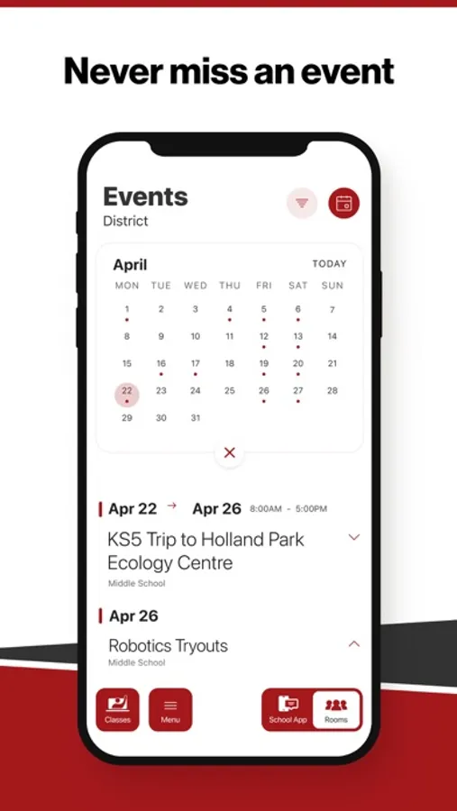 The event section shows a list of events throughout the district. Users can add an event to your calendar to share the event with friends and family with one tap.