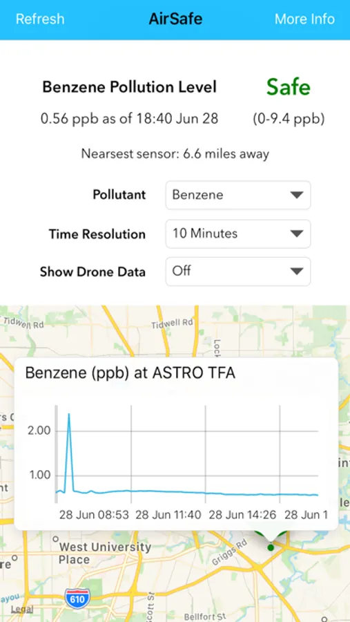 The AirSafe app is part of the community-facing end of a collaborative project by Rice University. The project hopes to provide useful, high granularity data about the gases in the atmosphere to both researchers and members of the community.