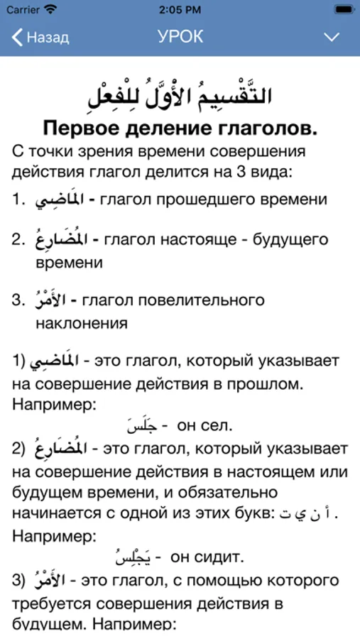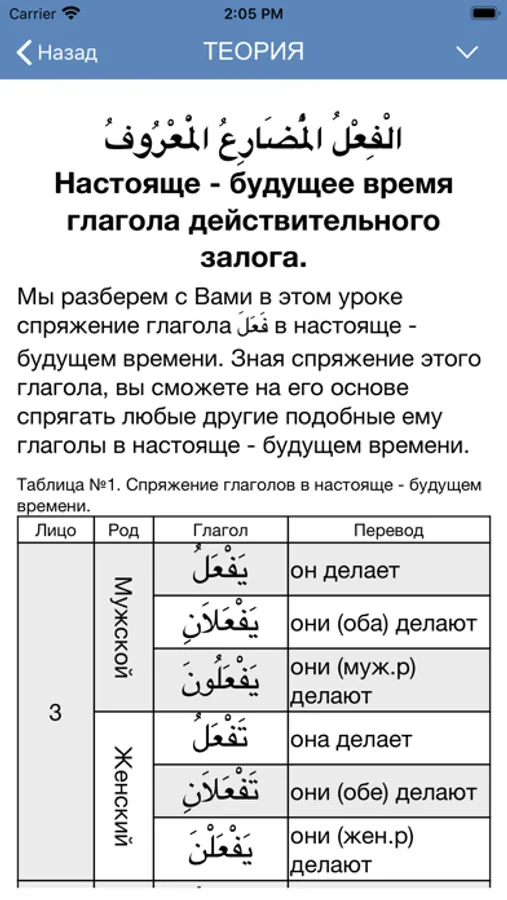 Занимаясь по этому приложению, вы поймете как образуются и спрягаются арабские глаголы и прочно запомните их спряжение.