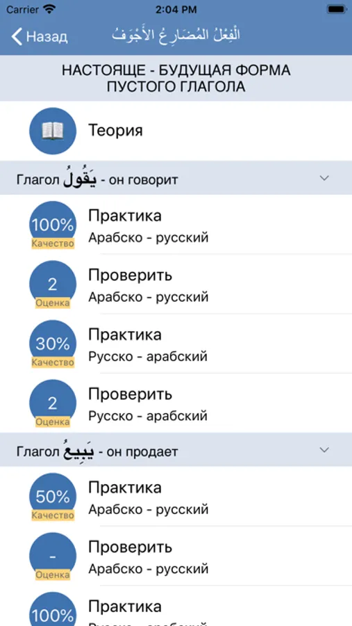 На начальном экране напротив кнопок уроков, в которых есть тесты, в кружке даются две оценки полученные в "Проверить" за арабско - русский и русско - арабскую часть соответственно. Если в этом уроке несколько глаголов, то оценка дается средняя по арабско - русскому и средняя по русско - арабскому направлению. После выбора урока, на следующем экране, напротив кнопок "Практика" в кружочке показывается отношение правильных ответов к общему количеству ответов (правильных и неправильных) в процентах. Напротив кнопок "Проверить" в кружочке показывается оценка.
