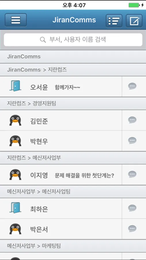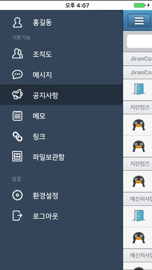 - 조직도 : 조직도에 등록된 사용자 검색 및 프로필 보기