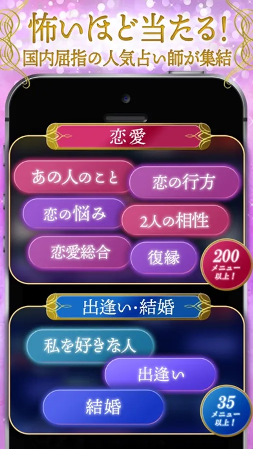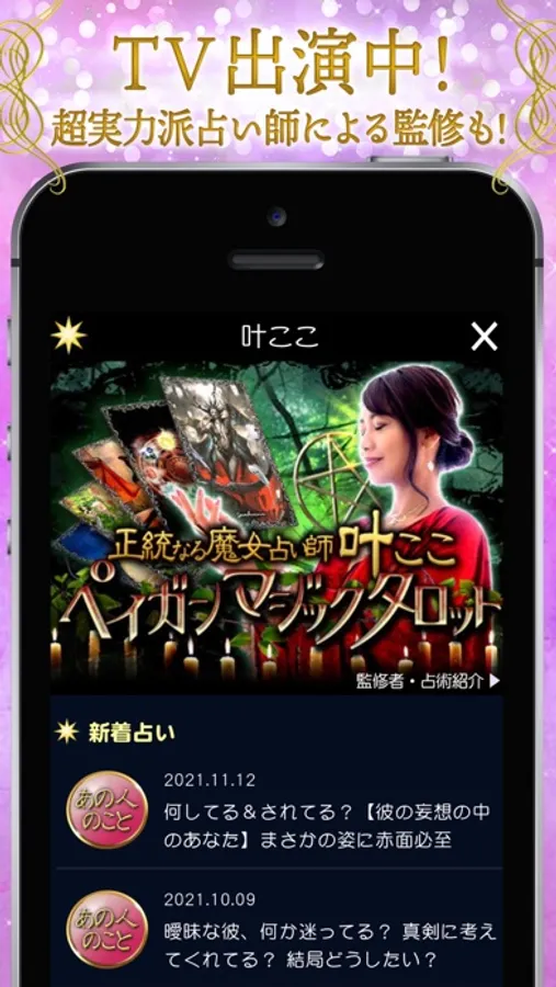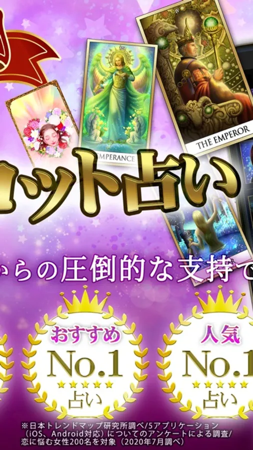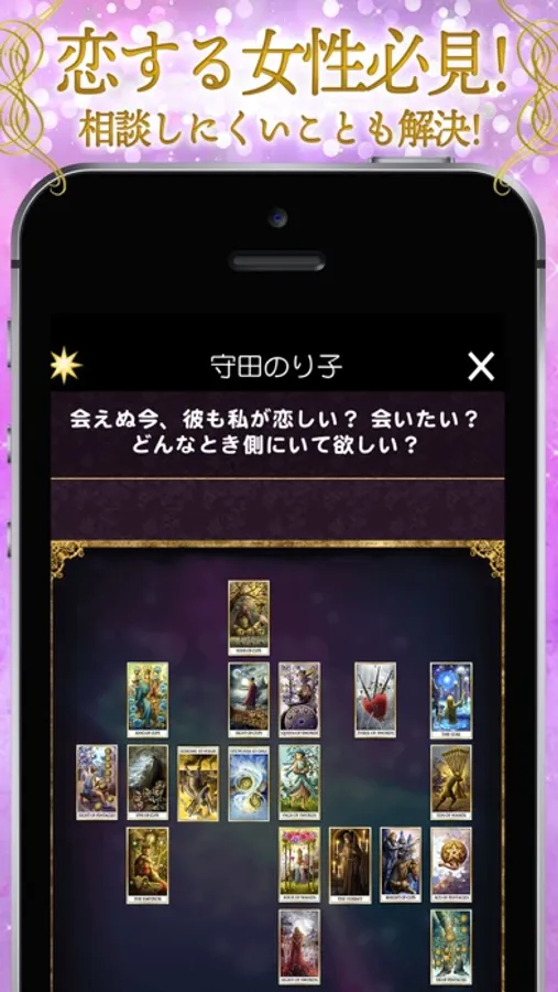 「気になるあの人の気持ち」や「大好きな彼のホンネ」など、恋するあなたが知りたいことを、人気の有名占い師が本格鑑定する、本格タロット専門アプリです。