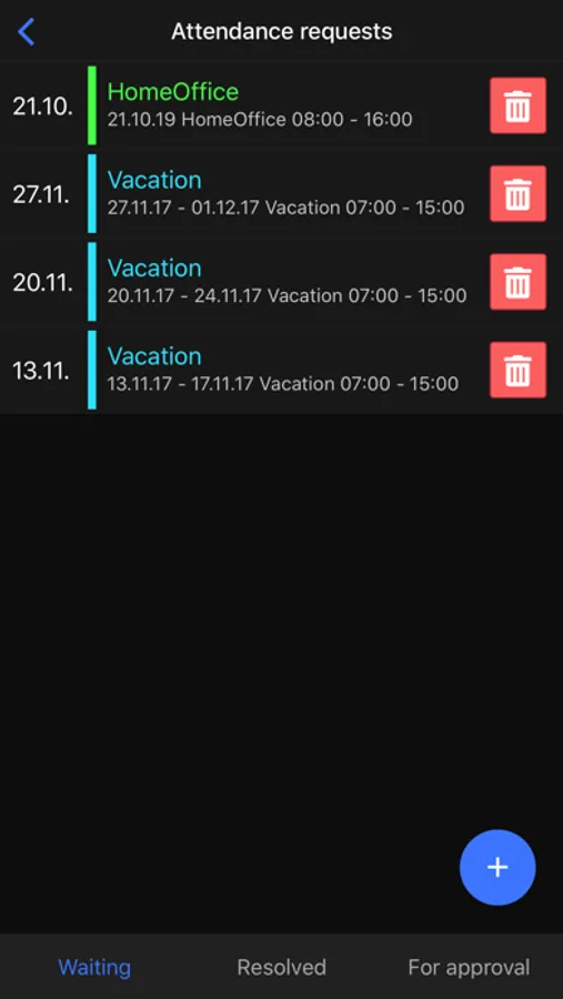 Also attendance requests (Vacation request, Doctor request, ...) can be submited from the app to be approved or rejected by admin in cloud app.