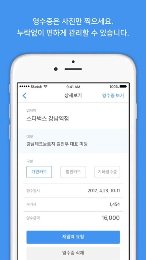 수시로 발생하는 번거로운 종이증빙은 따로 모아두지 마시고 스마트폰으로 촬영만 하세요.