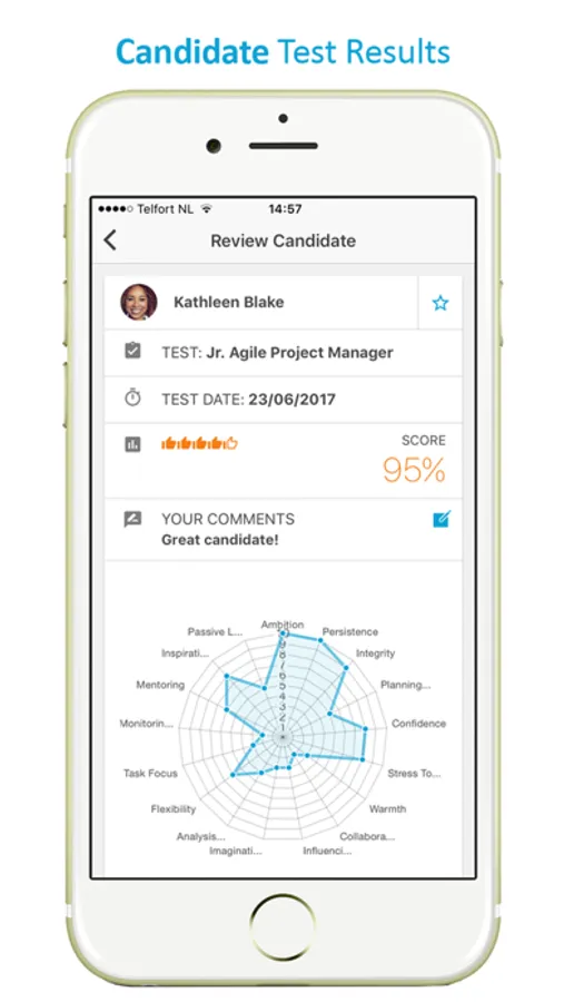 • Review the results – When a candidate completes the psychometric questionnaire, the manager automatically receives the full personality profile broken down into a range of insightful categories.