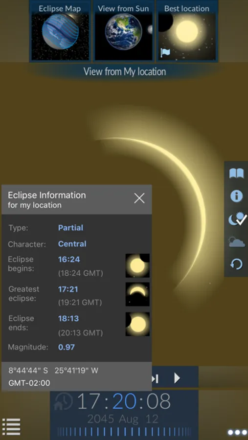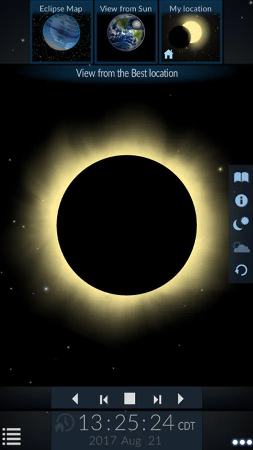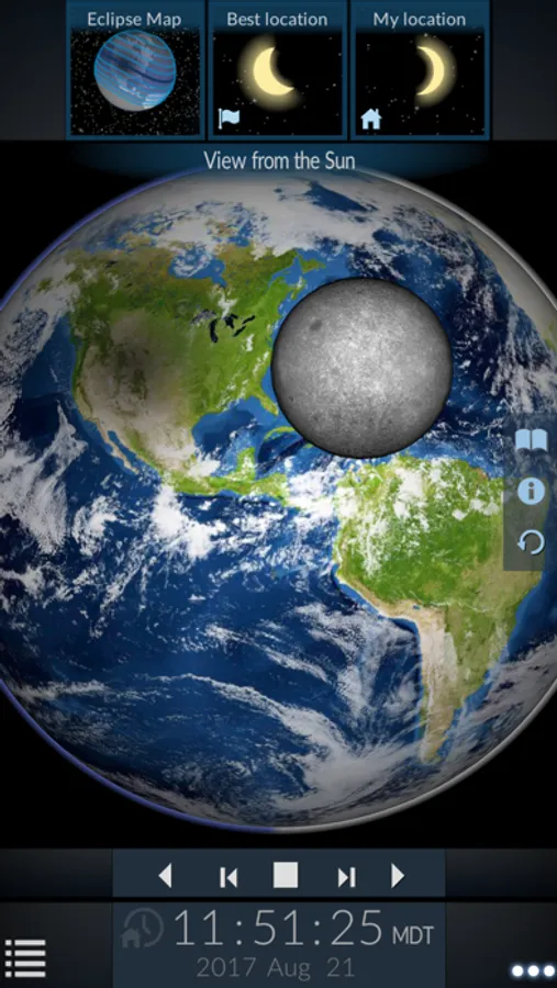 • Four different interactive eclipse simulations: View from current location, View from best location, View from orbit around the Earth, View from the Sun