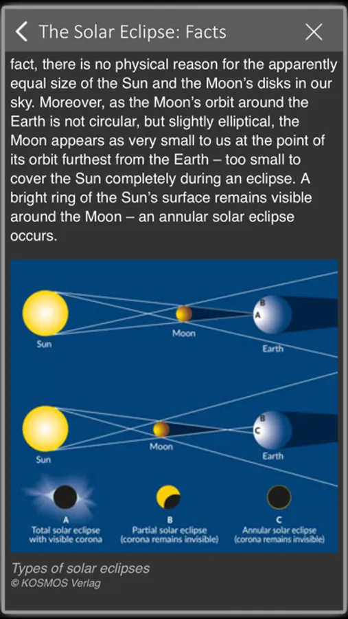 Experience solar eclipses, all shown in vivid, interactive simulations. Find out where to observe the solar eclipse from the best location. Witness the celestial event as observed from a point near the Sun. Read all the fascinating facts about the Sun and the development of a solar eclipse, and get useful tips for observing a solar eclipse.