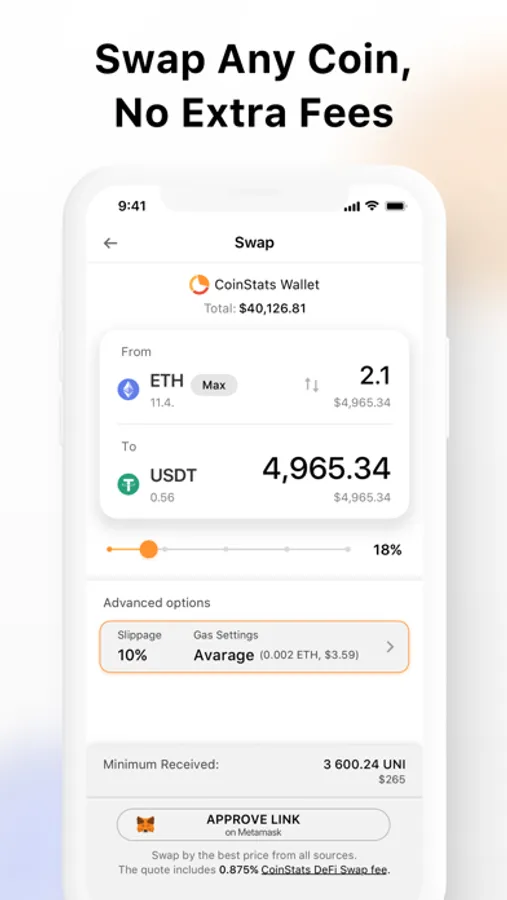 Use CoinStats Wallet to manage all your assets: 1 wallet to swap, track coins, track NFTs & earn on your crypto. With our DeFi wallet, you can easily access handpicked DeFi yield farming opportunities from 1 secure place & start earning with just a click!