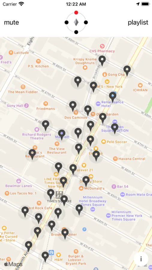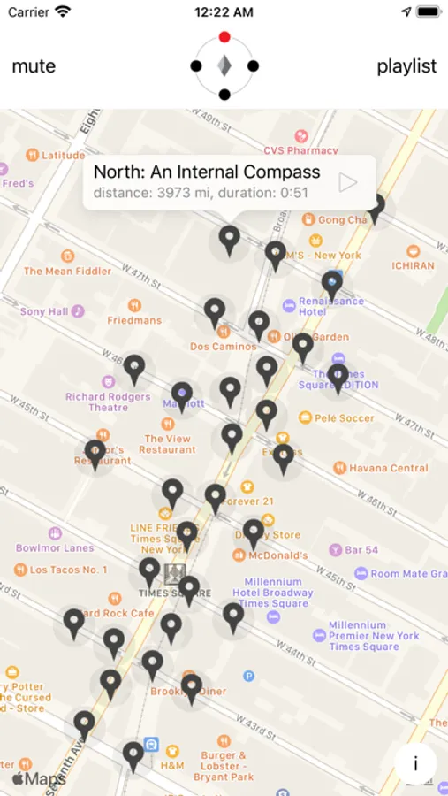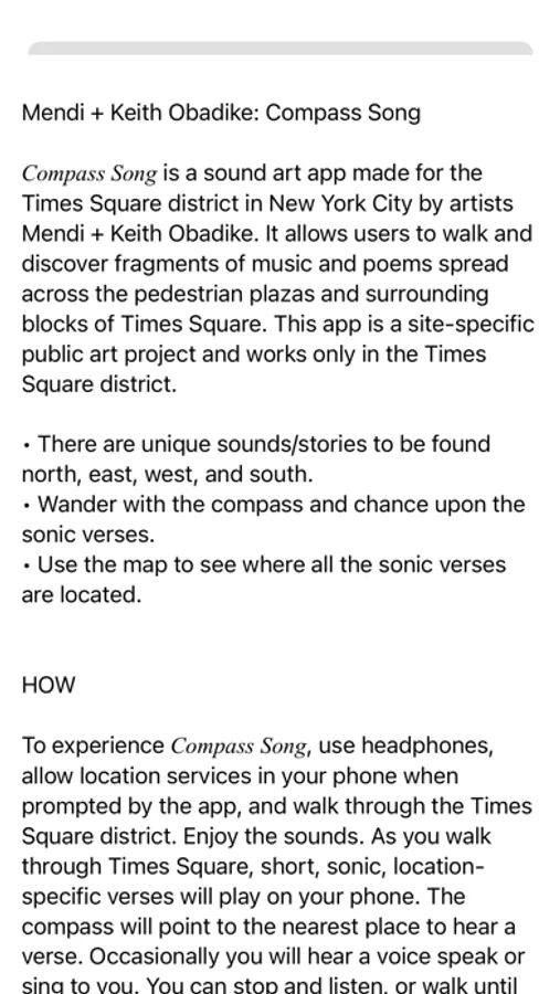 To experience Compass Song, use headphones, allow location services in your phone when prompted by the app, and walk through the Times Square district. Enjoy the sounds. As you walk through Times Square, short, sonic, location-specific verses will play on your phone. The compass will point to the nearest place to hear a verse. Occasionally you will hear a voice speak or sing to you. You can stop and listen, or walk until you discover a new verse. Press play on a visited map pin to hear a verse replay. You can also put your phone in standby mode, put your phone in your pocket, and continue to run Compass Song in the background. Please note, however, that continued use of GPS running in the background can dramatically decrease battery life. Press mute to turn off sound and stop location updates. You also can press playlist to hear a sonic verse directly from a map pin when you are outside of Times Square.