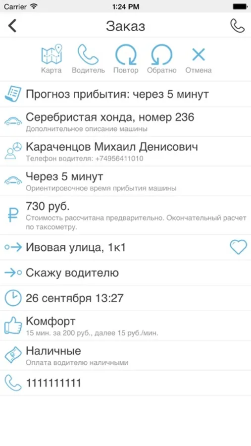 - Гибкая настройка параметров заказа с возможностью указать желаемые параметры автомобиля, а также выбрать дополнительные услуги, предоставляемые диспетчерской