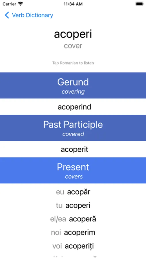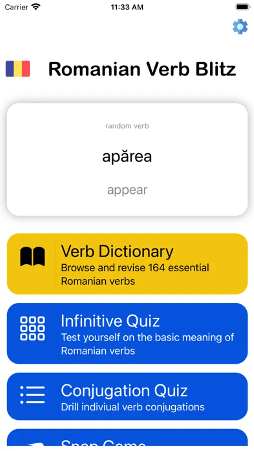 Learn and practise Romanian verbs with this interactive verb reference and drill tool. With over 160 core verbs, Romanian Verb Blitz is a clear and effective way to refresh and revise your grammar skills as well as expand your everyday vocabulary.