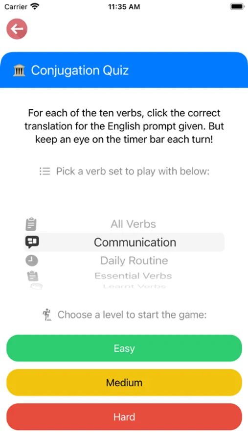 As well as a verb reference, there is a set of intensive verb drill activities to quiz your conjugation knowledge, including: