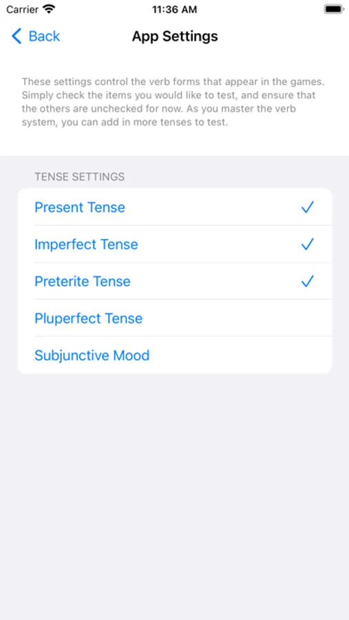 In the settings, you can select which tenses to drill in the games. So whether you're a beginner, or already on the way to mastery, there's a level for you!