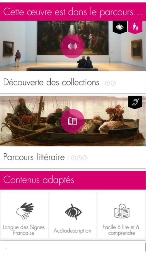 L’application propose des parcours et des contenus accessibles en audio-description, en langue des signes et en français facile à lire et comprendre (FALC). Les textes peuvent être agrandis et affichés en fort contraste, ainsi que certaines images d’œuvre.
