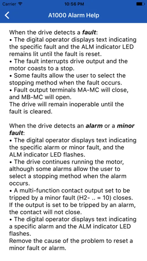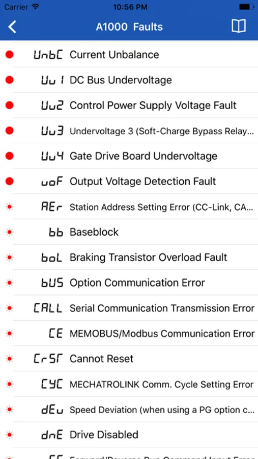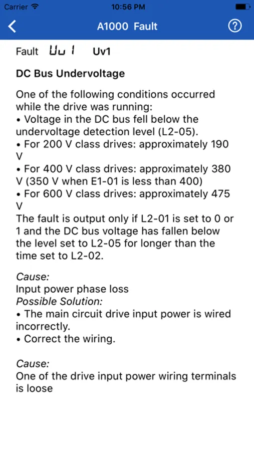 The 'yDrives - VFD help' app provides quick access to alarm descriptions of Yaskawa AC drives. In a second you get a full alarm description, troubleshooting guide and even a link to the latest user manual. App greatly helps by commissioning and service giving you the necessary information when you need it and where you need it.