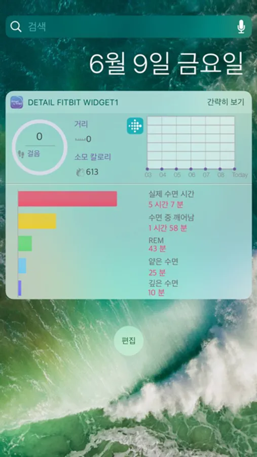 iOS에서 Fitbit Widget을 사용 하세요. 목표를 기준으로 현재까지 달성율을 원 그래프로 표시하고 일주일간 데이터도 그래프로 그려 줍니다.