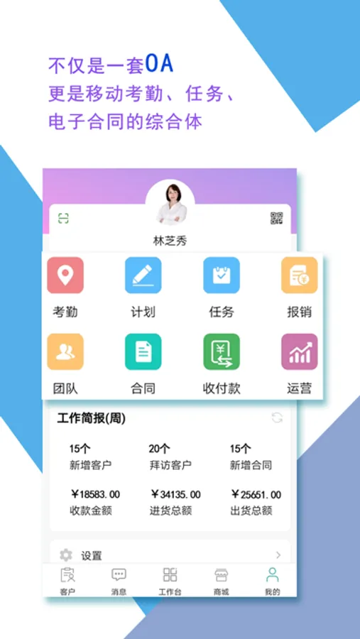 3、企业无纸化办公,现在在线合同申请、审批、工作汇报提交、无纸化报销申报、位置识别考勤等功能。