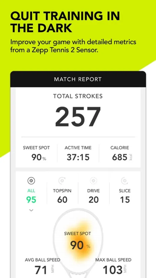 When you’re ready to take your game to the next level, connect the Zepp Tennis 2 sensor to your iPhone or Series 2 or 3 Apple Watch and you’ll see why Zepp is the smartest and fastest way to improve. The sensor instantly measures the most important aspects of your stroke: ball speed, ball spin, and sweet spot consistency. Strokes are automatically classified as forehands, backhands, volleys, smashes, and serves; and further sorted into topspin, drive, and slice. Detailed statistics identify your strongest strokes and the areas where you can generate the greatest improvement.