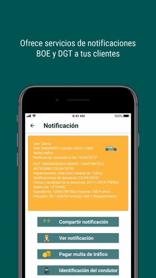 tamé es una aplicación que al introducir tu DNI o NIE (O NIF de empresas) se conecta directamente al BOE y DGT, obtiene las notificaciones diariamente y las envía a tu dispositivo Smartphone o Tablet, pudiendo así notificar inmediatamente y evitando posibles recargos, ahorrando hasta un 50% según el tipo de notificación.