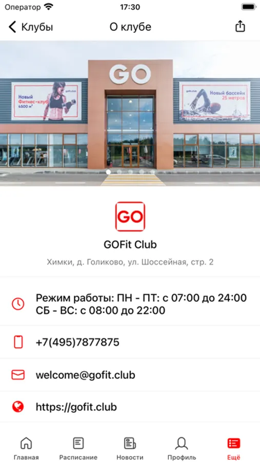 GOFit – это место для людей который живут спортом, для тех, кто хочет испытать себя и узнать, где находятся пределы возможностей. Современный фитнес-клуб бизнес-класса, общей площадью 4500 кв.м. Тренажеры нового поколения, кардиозона, зона кроссфит, бассейн 25 метров, детский бассейн, более 25 видов групповых программ, фитнес для детей, салон красоты и фитнес кафе, просторные раздевалки, мощные системы кондиционирования и вентиляции делают посещение фитнес-клуба комфортным для гостей и членов клуба.