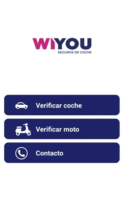 Permite la verificación del vehículo y el envío de fotografías y documentación en caso de accidente. Además, muestra los teléfonos de Wiyou Seguros.