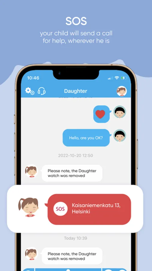 • Receive SOS alerts from the watch in case of emergency: along with the alert, you'll receive your kid's location, as well as an audio recording from the watch microphone.