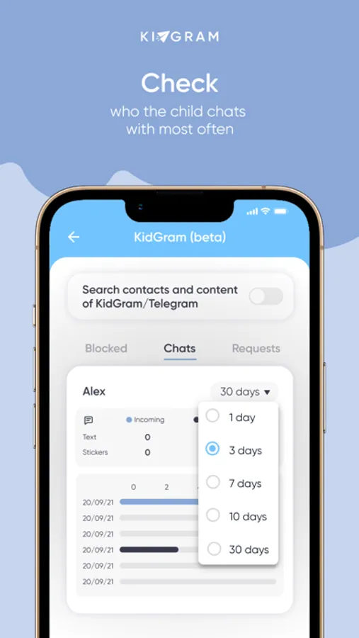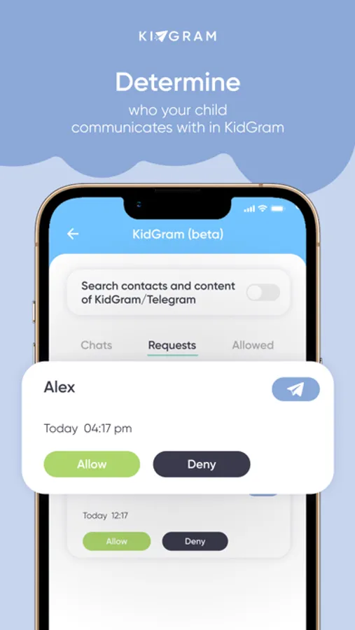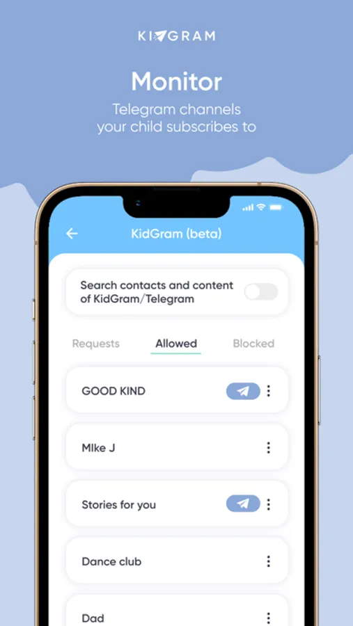 • you can allow or forbid the child to search for new channels or contacts in Telegram. Even if the search is enabled, still the kid won’t be able to add a new contact or even view/subscribe to a channel without your approval in the SafeFamily app.