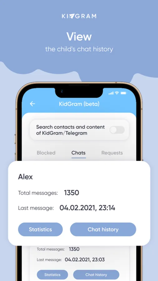 • through the SafeFamily app you initially allow and always see a list of contacts, groups and channels the kid interacts with, plus the statistics and the chat history for the last 3 months.