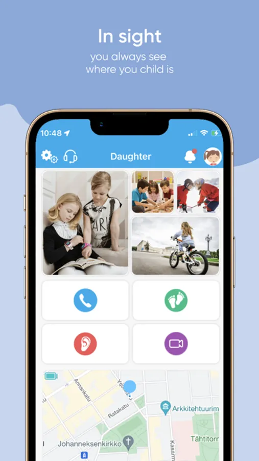 • Set permitted geofences – virtual areas around the kid's regular whereabouts: kindergarten, school, home. If the kid is outside the defined area, you will receive a notification