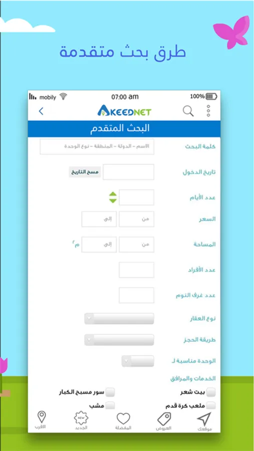 يتيح تطبيق أكيد نت كذلك إمكانية البحث المتقدم بمعايير متعددة مثل السعر والمساحة ، والعديد من الخصائص والمرافق المتاحة ، ليكون أكثر مرونة وملائمة لجميع المستخدمين.