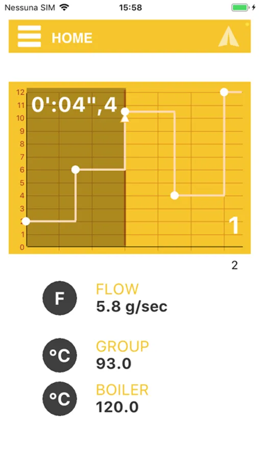 - On the main screen, is displayed a graph with selected profile, the temperatures of group and boiler or other information depending on machine selector position.