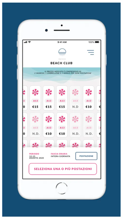Accedi ad iPlaya, seleziona il tuo lido, indica la data in cui vuoi effettuare una prenotazione e la fascia oraria preferita (mattina, pomeriggio o intera giornata), seleziona quindi un ombrellone tra quelli disponibili e conferma la tua prenotazione. Ora sei pronto a goderti la tua giornata di mare.