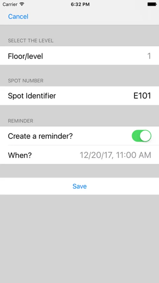 After parking your car, use the app to record the floor and the spot id, you can also set a reminder for minutes before you leave and a notification will be send to you with the information.