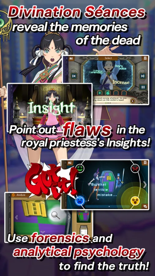 In place of witness testimonies, the Royal Priestess of Khura’in offers the court her divine Insights, which are her interpretations of a victim’s final memories. Find the flaws in her Insights by comparing them to the Séance vision and the evidence, and reveal what really happened!
