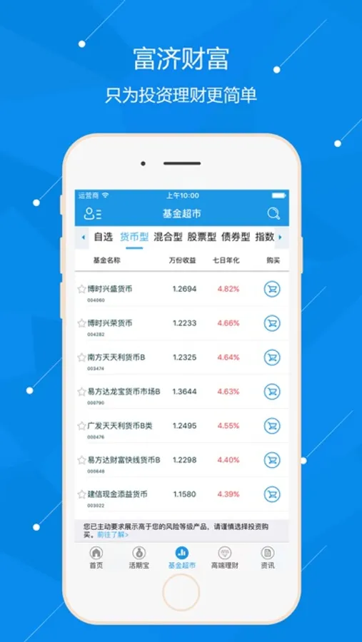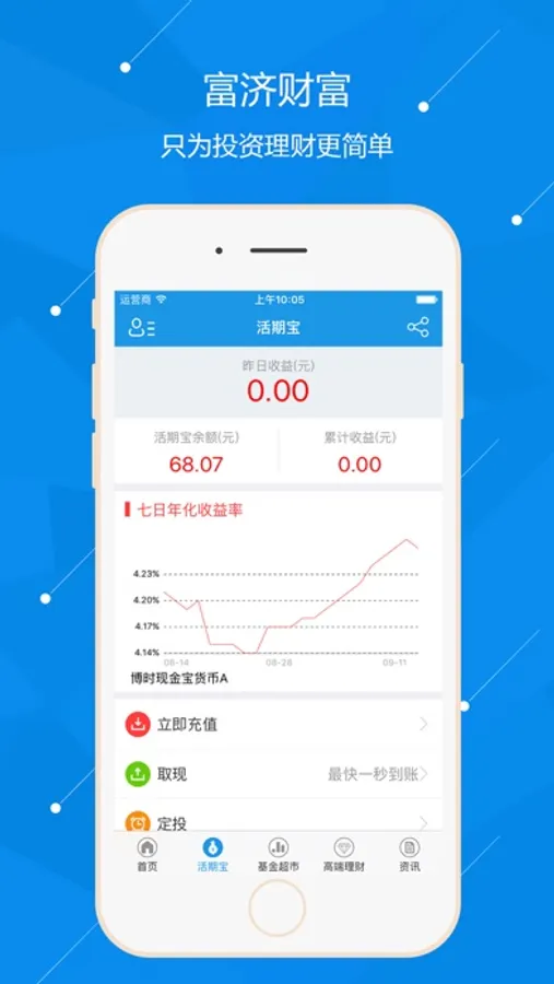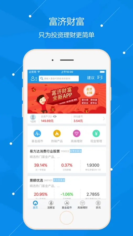 你不理财,财不理你,富济基金app是富济基金旗下一款移动端一站式理财平台。平台展示实时基金行情查询,筛选时下最热销的基金信息,也为新用户提供安全、便捷的免费开户入口。富济基金拥有中国证监会颁发的基金销售牌照,我们致力于打造专业理财团队,让每一位基民享受安全可靠、专业规范的理财服务。富济基金app,让你理财变得更容易。