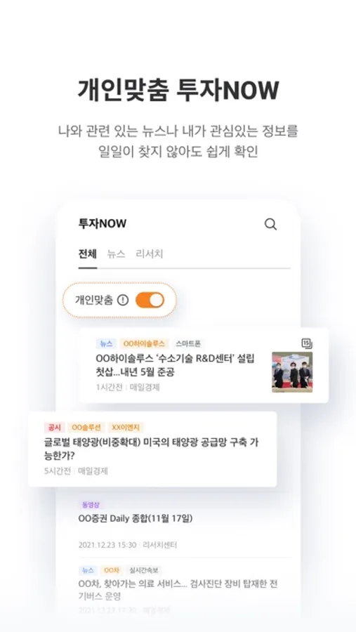 -내가 원하는 국내/해외주식과 상품, 투자정보를 하나의 키워드로 통합 검색하고, 내가 관심있는 뉴스나 리서치, 금융정보를 일일이 찾지 않아도 통합 피드에서 모아볼 수 있습니다.