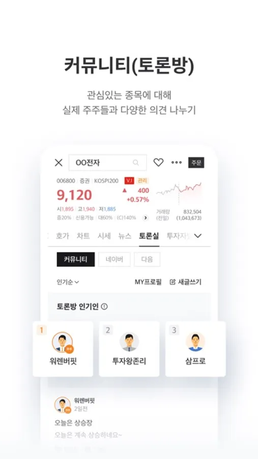 -나와 같은 종목을 투자하는 투자자는 어떤 생각을 하고 있는지 궁금한적 있으셨나요? 실제 주주들이 내 주식에 대한 투자 아이디어와 정보를 나눌 수 있는 종목 토론 커뮤니티를 제공합니다.