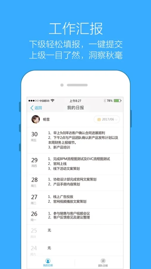 手机考勤、签到定位、记一笔、说一句、扫一扫、日报、周报、月报、企业通讯录、报表等。