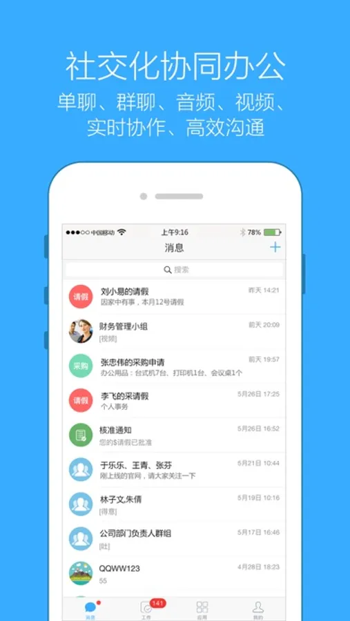 群聊、私聊、流程讨论、小组动态、语音聊天、表情、图片、短视频、附件。