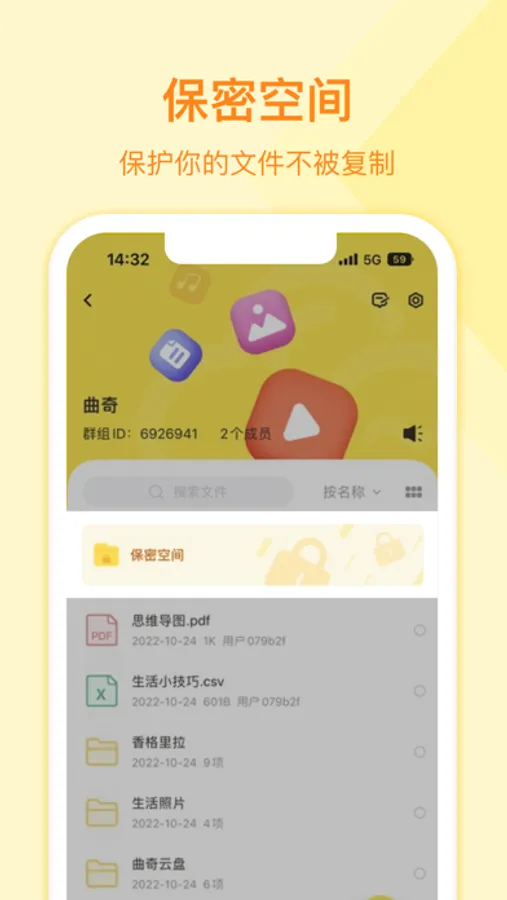 建群加群,邀请好友一起共享文件;一人分享,全群共享。群内文件无须下载,高清内容在线观看,照片文档实时预览。进入群组,共创美好生活。