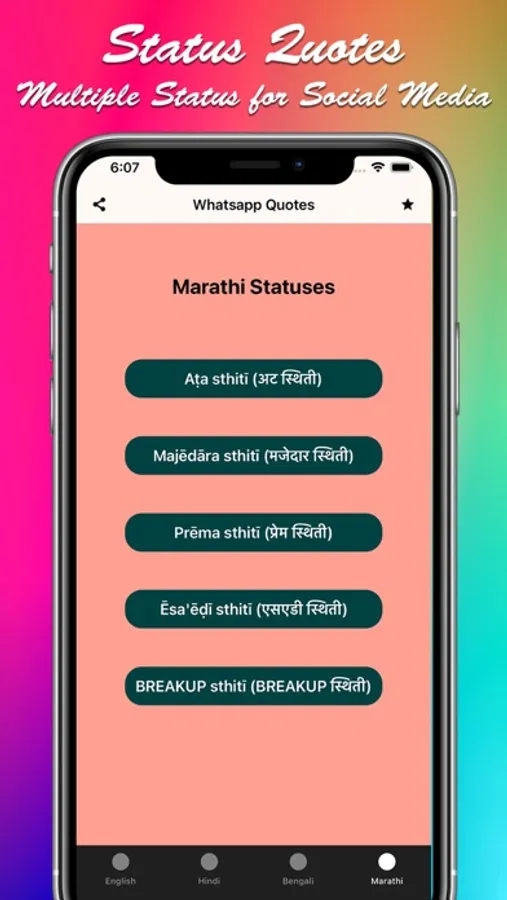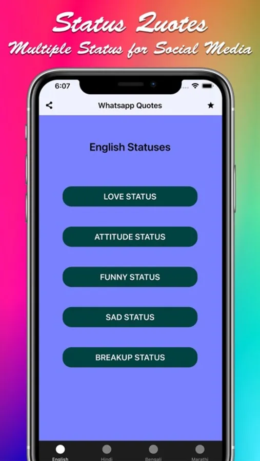 Statuses app contains save and downloader Statuses in English, German, French, French, Spanish, Italian, Hindi, Marathi and Bengali.