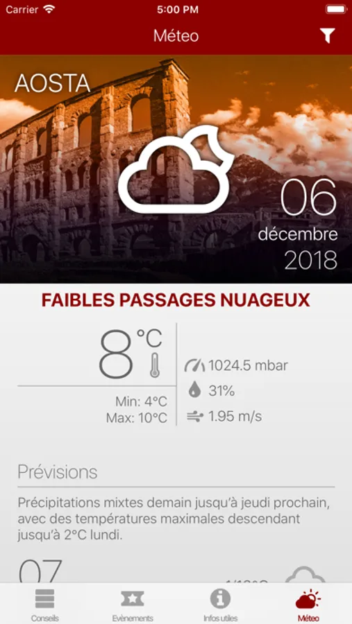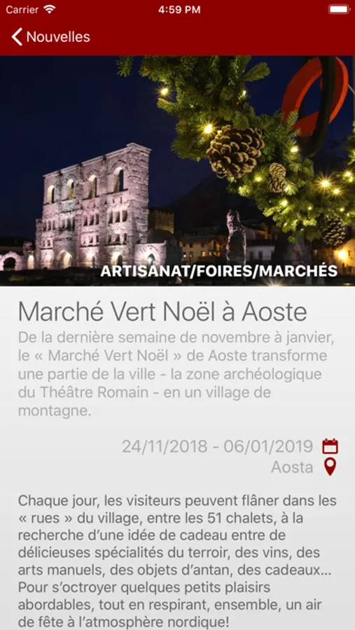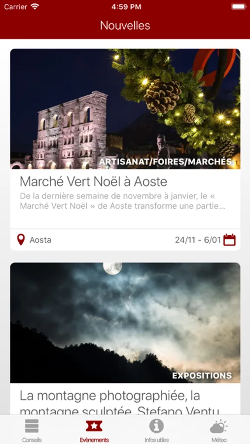 L'application te tiendra aussi informé chaque semaine des manifestations culturelles et touristiques de la Vallées d'Aoste, te donnera des recettes de cuisine et s'occupera de culture locale dans la section « Evénements », tandis que tous les mois tu recevras les « nouvelles » des entrepreneurs locaux, des offres spéciales et des curiosités.