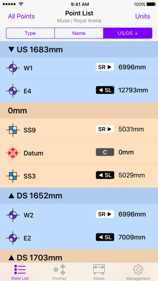 Creates a sorted markout list. X- and Y-coordinates are translated into US/DS and SL/SR and points are automatically grouped. Small tolerances are automatically filtered out, so all point within 50mm are grouped together. Minimize errors and time used for chalk out with this functionality. SR or SL points can be filtered out to make it possible for two riggers to chalk out on the same dataset on bigger productions.