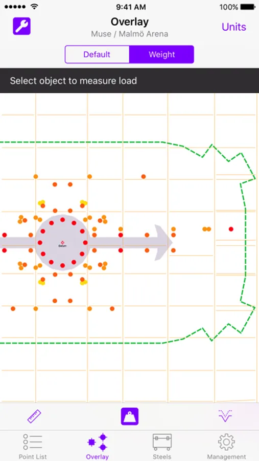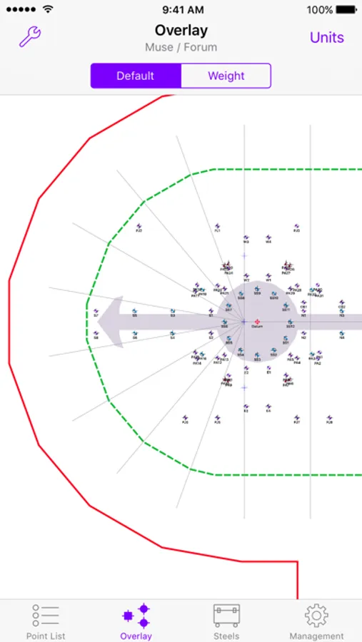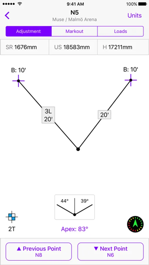 Hyperlay can automatically creates individual bridle assemblies. The bridles are automatically calculated based on hook height or bridle drop. But the user can easy adjust the individual assemblies to their needs and the total steel count are updated instantly with every change you make. Hyperlay even utilizes the iPhone's gyroscope to orientate the bridle correctly within the venue to avoid wrong configurations. Accurate calculations gives increased safety and reduces load-in time of the production and needed WAH.