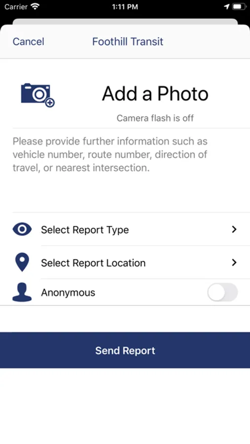 * The “Report an Issue” button allows users to send text or photos directly to Foothill Transit. To ensure discretion, the camera flash is automatically disabled when photos are taken through the app. When reporting an issue, users can select locations and report categories to assist Foothill Transit. Riders can also send reports anonymously if they chose.