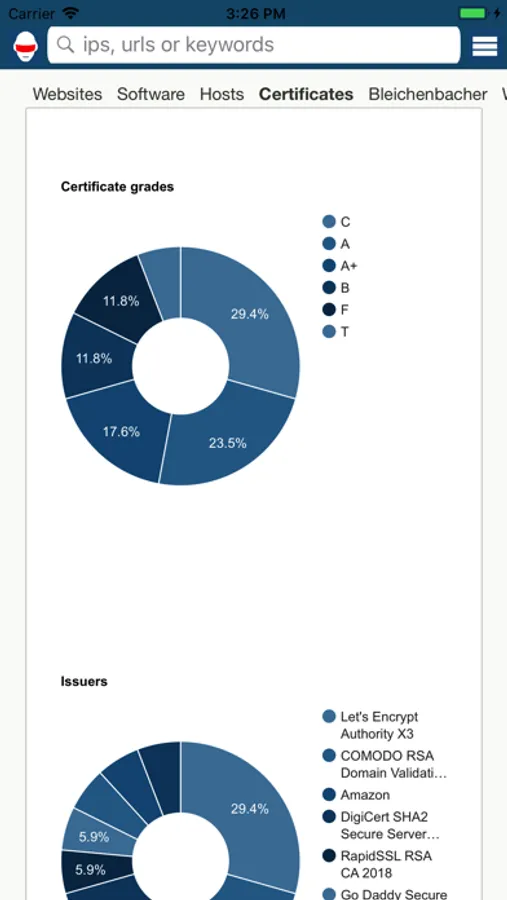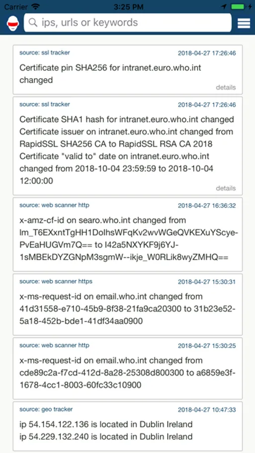 On your timeline you can see the changes to your websites and servers. Expiring certificates, servers changing providers, websites showing unexpected behavior and more. You can access all this on both your iOS device and your desktop through our web login. The app enables you to receive instant messages for critical security problems. It also allows you to quickly look up all changes on a specific website in the last months while you're in a meeting.