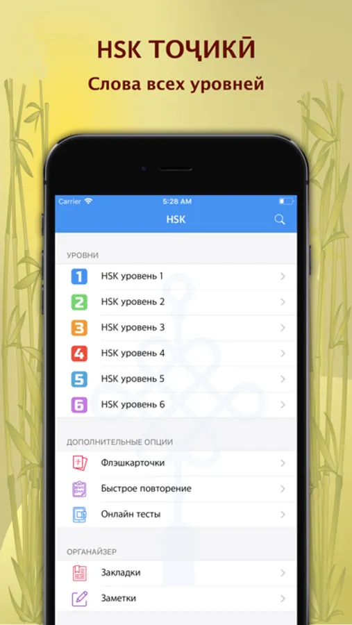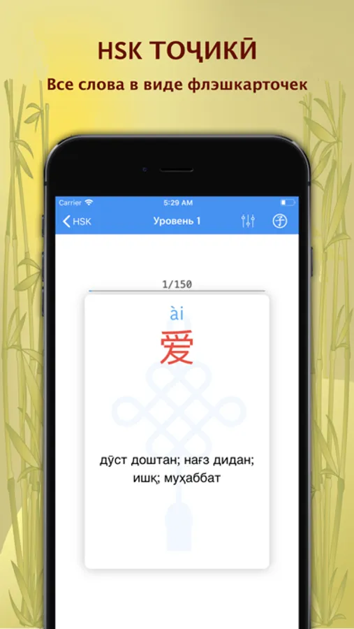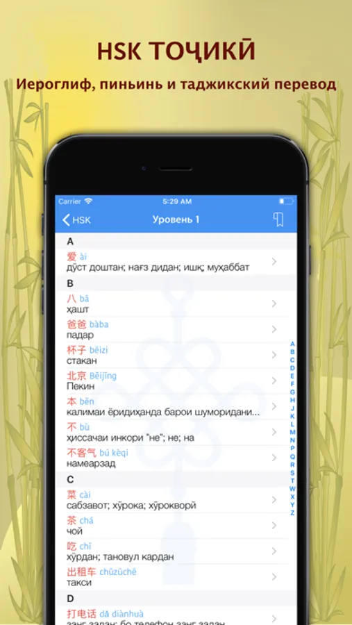 Это приложение специально создано для тех, кто изучает китайский язык и готовится к экзамену HSK (кит. Hànyǔ Shuǐpíng Kǎoshì) - стандартизированный квалификационный экзамен по китайскому языку (путунхуа) для лиц, не являющихся носителями китайского языка, а именно иностранных студентов, зарубежных китайцев и представителей этнических меньшинств, проживающих в КНР. Квалификационный экзамен HSK является единой формой аттестации иностранных учащихся. Результаты экзамена HSK признаются во всем мире. Максимальный (последний) уровень HSK содержит более 5000 наиболее часто употребляемых китайских слов. Все эти слова переведены на таджикский язык по определённым уровням. Данное приложение также можно использовать как Китайско-Таджикский и Таджикско-Китайский мини-словарь.