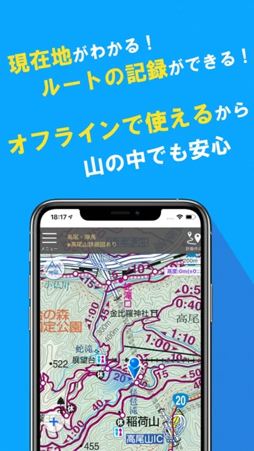 地図は事前にダウンロードしてスマホに保存するので、電波が届かない山の中でも使えます。