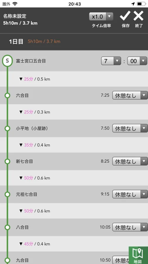 コースタイムが設定したタイム倍率で自動計算されるので、自分に合った無理ない計画が可能です。